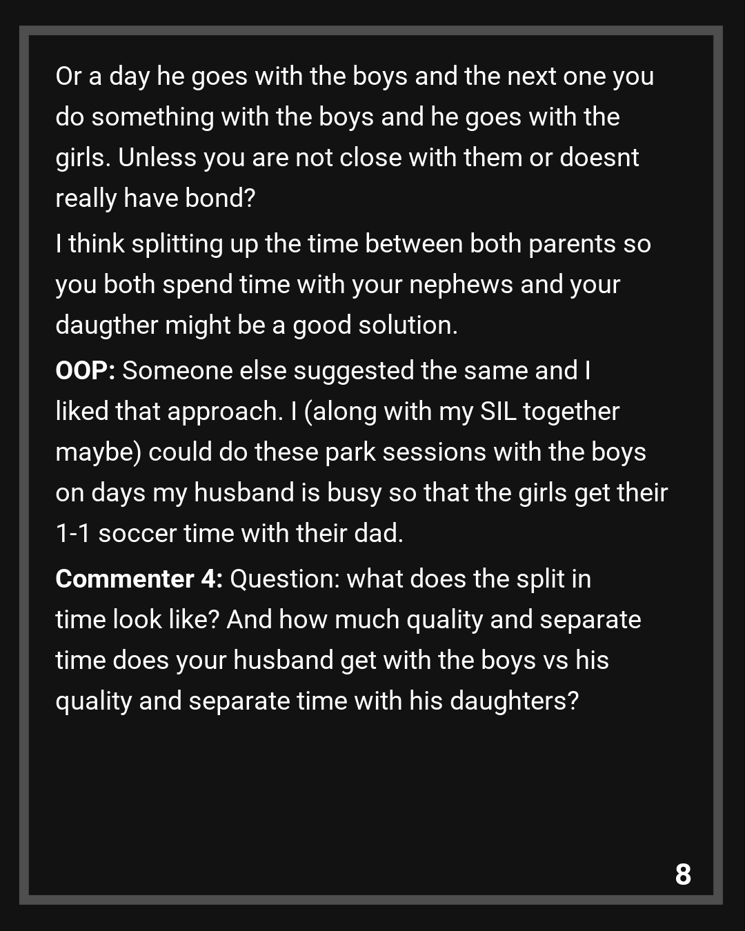 Commenter 4: Question: what does the split in time look like? And how much quality and separate time does your husband get with the boys vs his quality and separate time with his daughters?