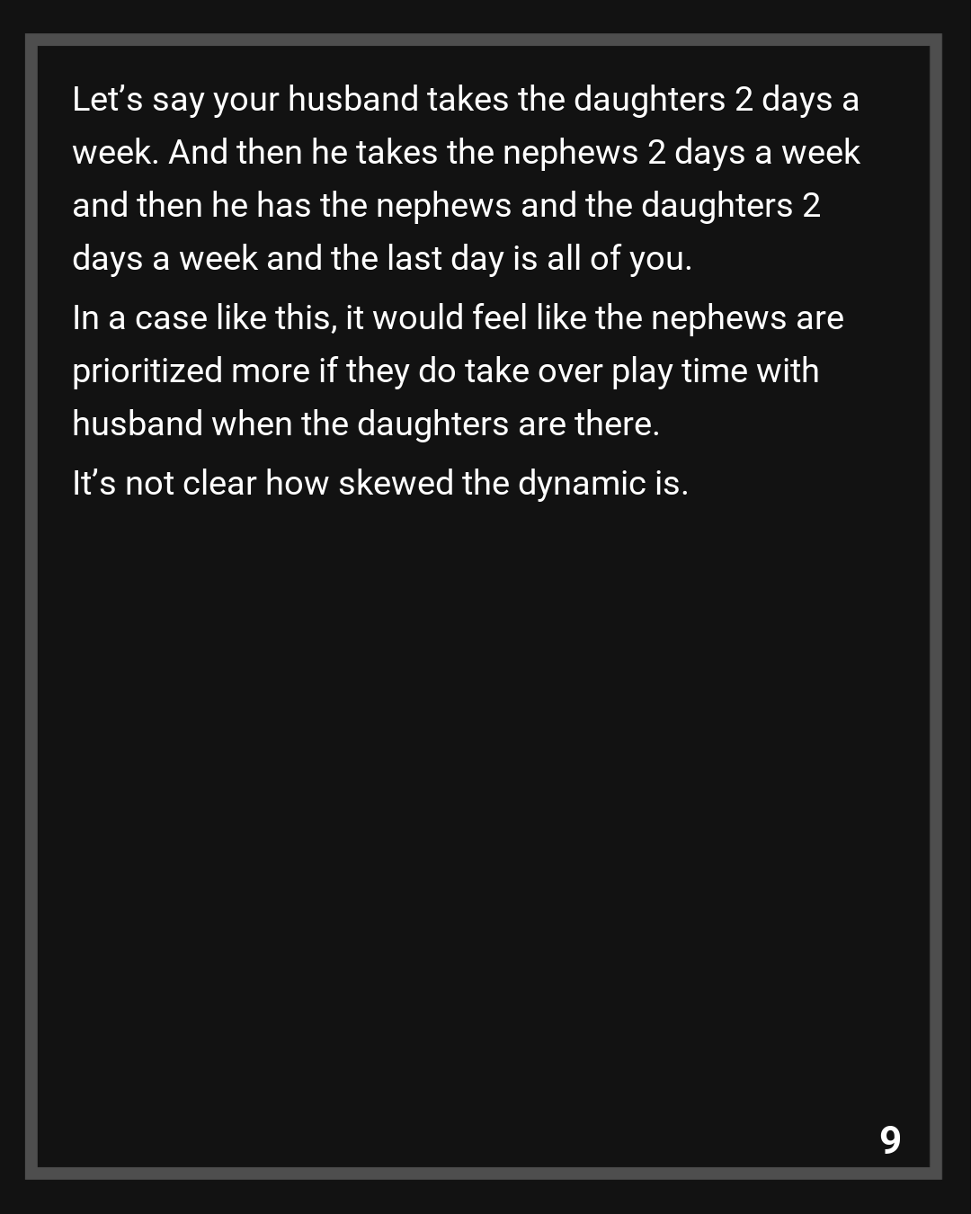 Let’s say your husband takes the daughters 2 days a week. And then he takes the nephews 2 days a week and then he has the nephews and the daughters 2 days a week and the last day is all of you. In a case like this, it would feel like the nephews are prioritized more if they do take over play time with husband when the daughters are there.