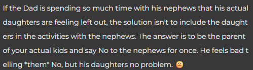 I get it, your daughters miss spending time with their dad when their cousins come over but how often can the boys say that about their dad? They need some male influence and it appears their uncle is all they have. I’ll say NAH.