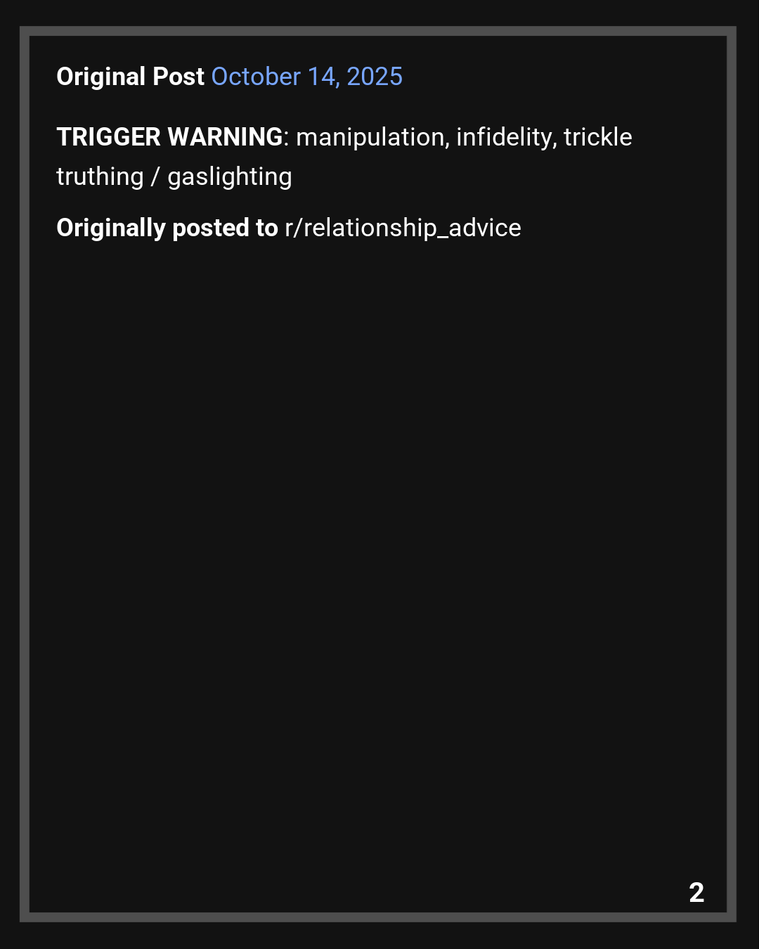 Trigger Warnings: manipulation, infidelity, trickle truthing / gaslighting