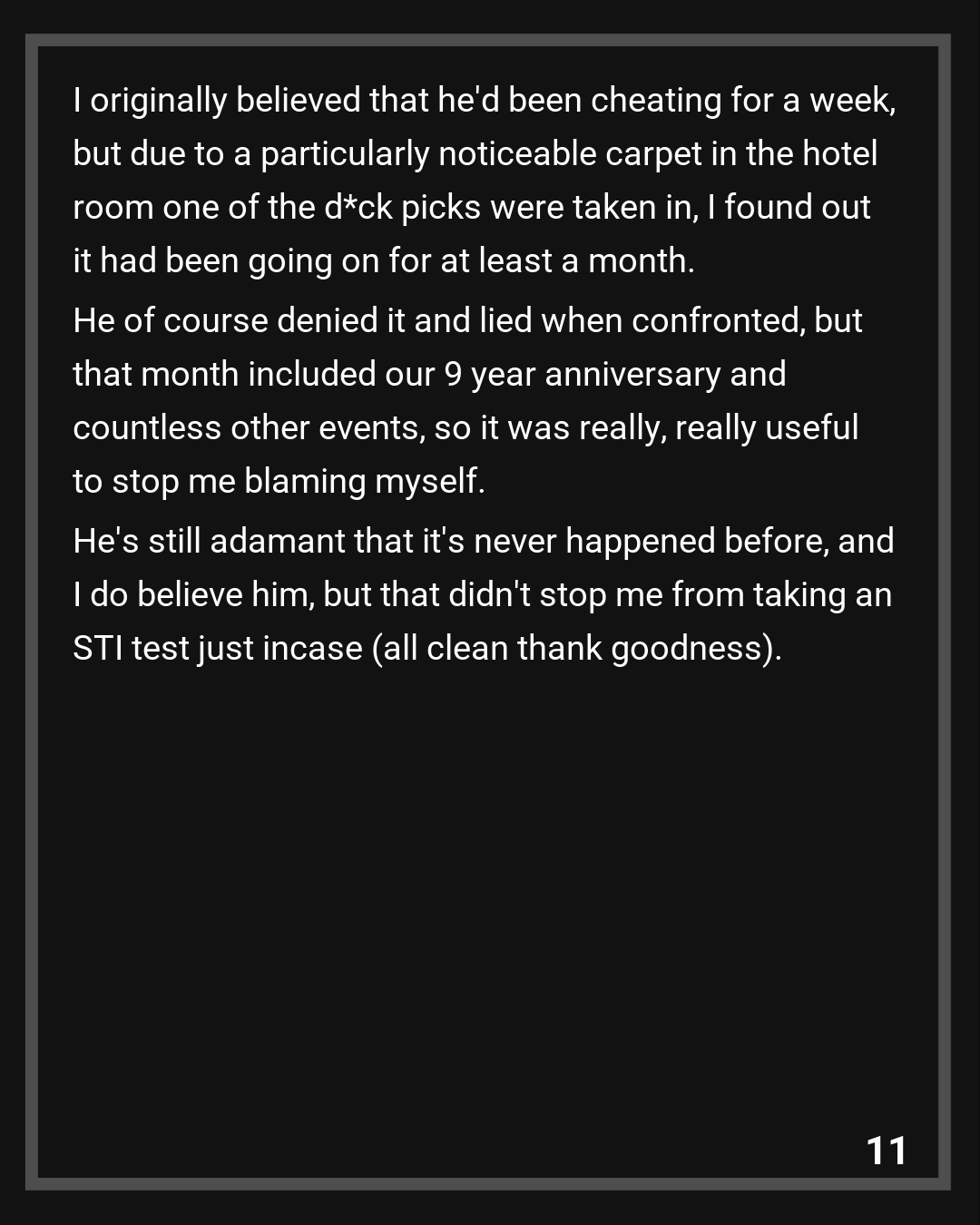 To start it off, many of you said that he’d been cheating for longer or had done so before…you were right. I originally believed that he’d been cheating for a week, but due to a particularly noticeable carpet in the hotel room one of the d*ck picks were taken in, I found out it had been going on for at least a month. He of course denied it and lied when confronted, but that month included our 9 year anniversary and countless other events, so it was really, really useful to stop me blaming myself. He’s still adamant that it’s never happened before, and I do believe him, but that didn’t stop me from taking an STI test just incase (all clean thank goodness). He also admitted to lying about them having a previous relationship and I caught him in another lie about Snapchat messages, so he stayed true to form.