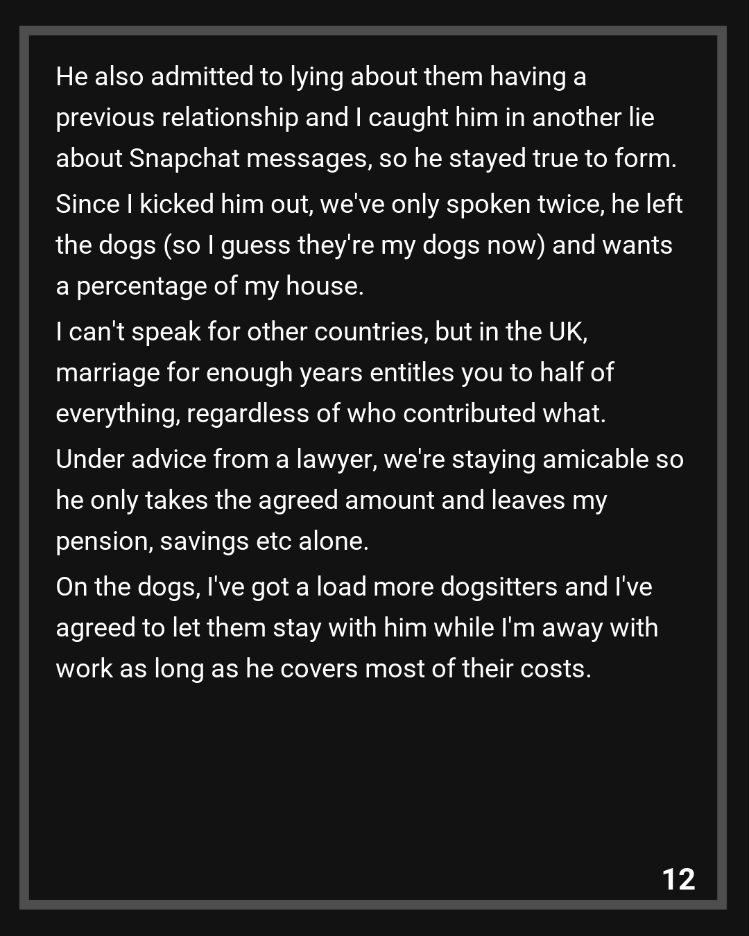 Since I kicked him out, we’ve only spoken twice, he left the dogs (so I guess they’re my dogs now) and wants a percentage of my house. I can’t speak for other countries, but in the UK, marriage for enough years entitles you to half of everything, regardless of who contributed what. Under advice from a lawyer, we’re staying amicable so he only takes the agreed amount and leaves my pension, savings etc alone. On the dogs, I’ve got a load more dogsitters and I’ve agreed to let them stay with him while I’m away with work as long as he covers most of their costs.