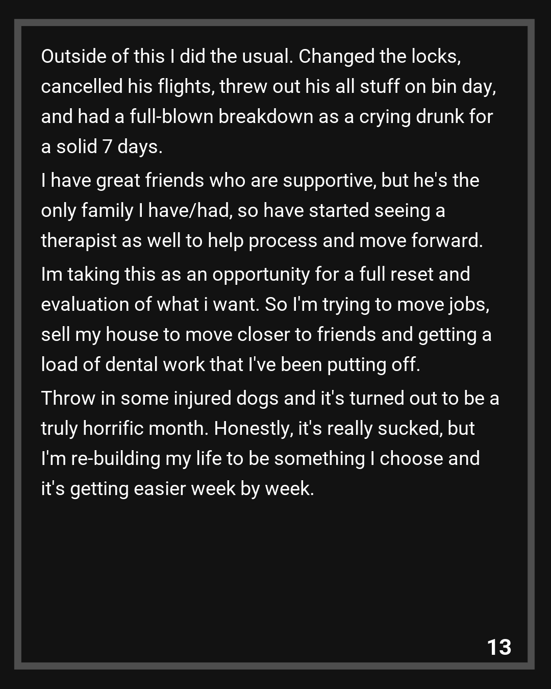 Im taking this as an opportunity for a full reset and evaluation of what i want. So I’m trying to move jobs, sell my house to move closer to friends and getting a load of dental work that I’ve been putting off. Throw in some injured dogs and it’s turned out to be a truly horrific month. Honestly, it’s really sucked, but I’m re-building my life to be something I choose and it’s getting easier week by week.