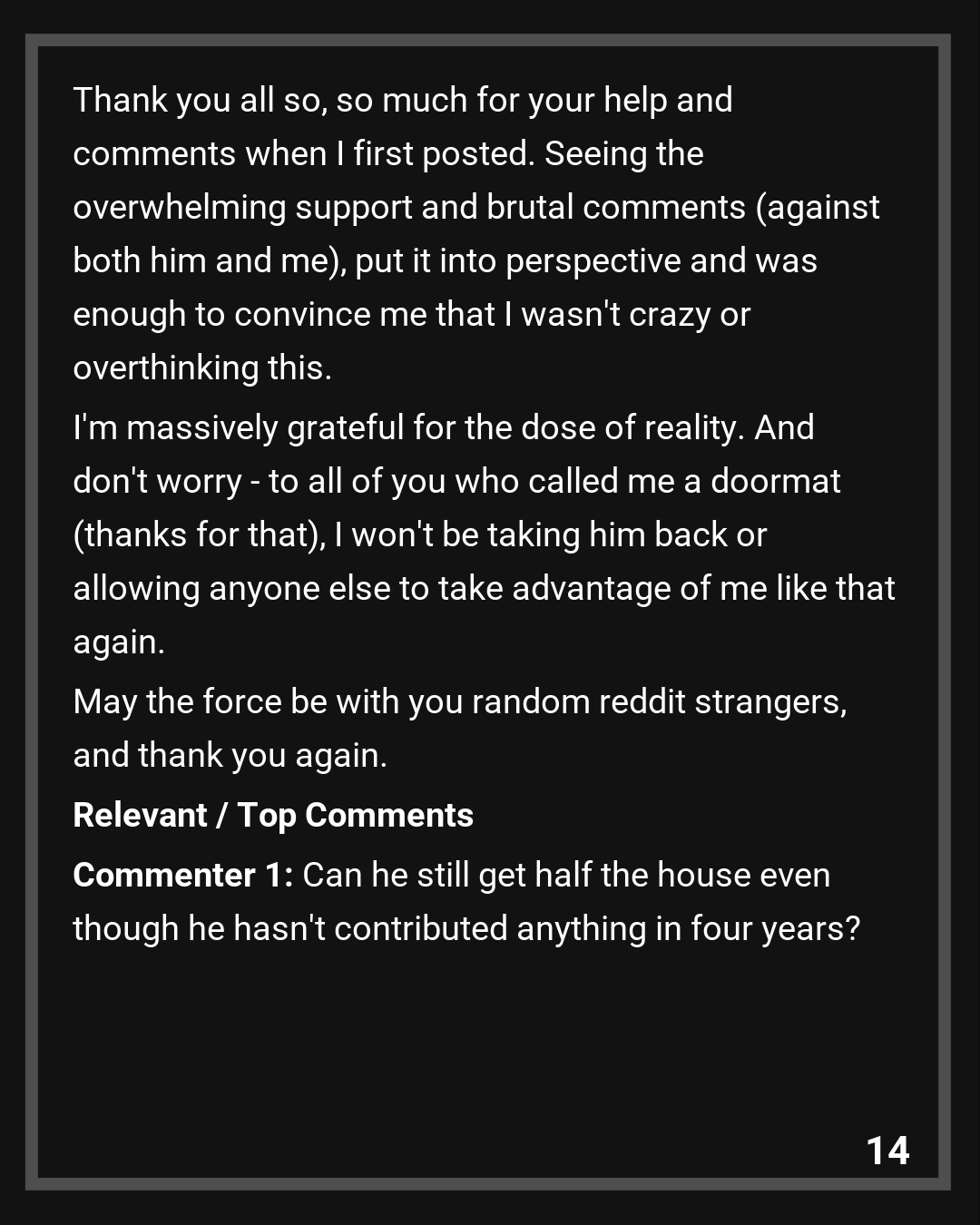 Commenter 1: Can he still get half the house even though he hasn’t contributed anything in four years?