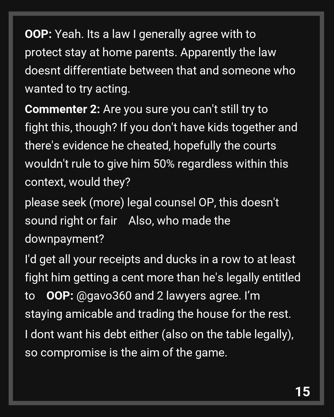 Commenter 2: Are you sure you can’t still try to fight this, though? If you don’t have kids together and there’s evidence he cheated, hopefully the courts wouldn’t rule to give him 50% regardless within this context, would they? please seek (more) legal counsel OP, this doesn’t sound right or fair