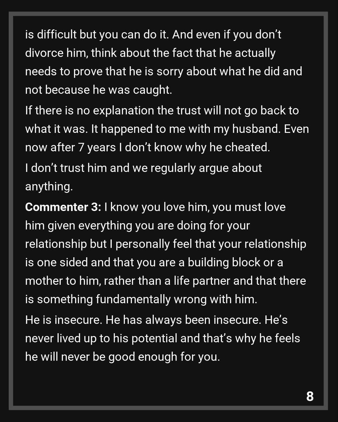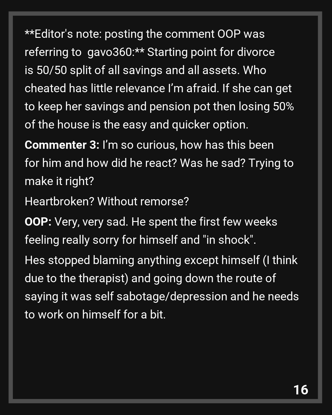 Commenter 3: I’m so curious, how has this been for him and how did he react? Was he sad? Trying to make it right? Heartbroken? Without remorse?