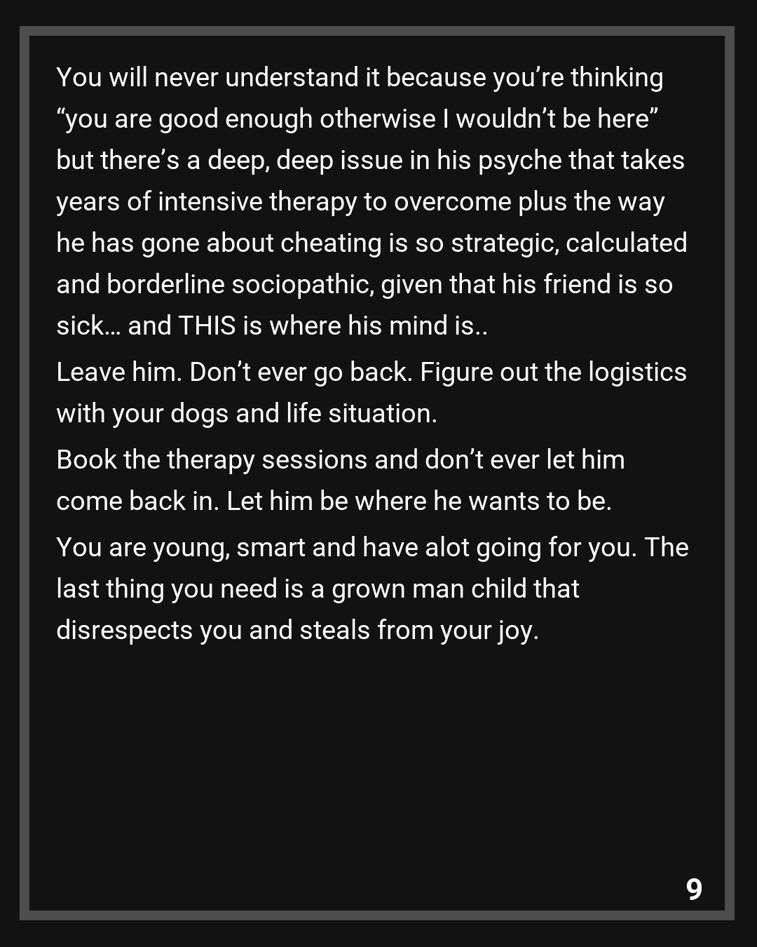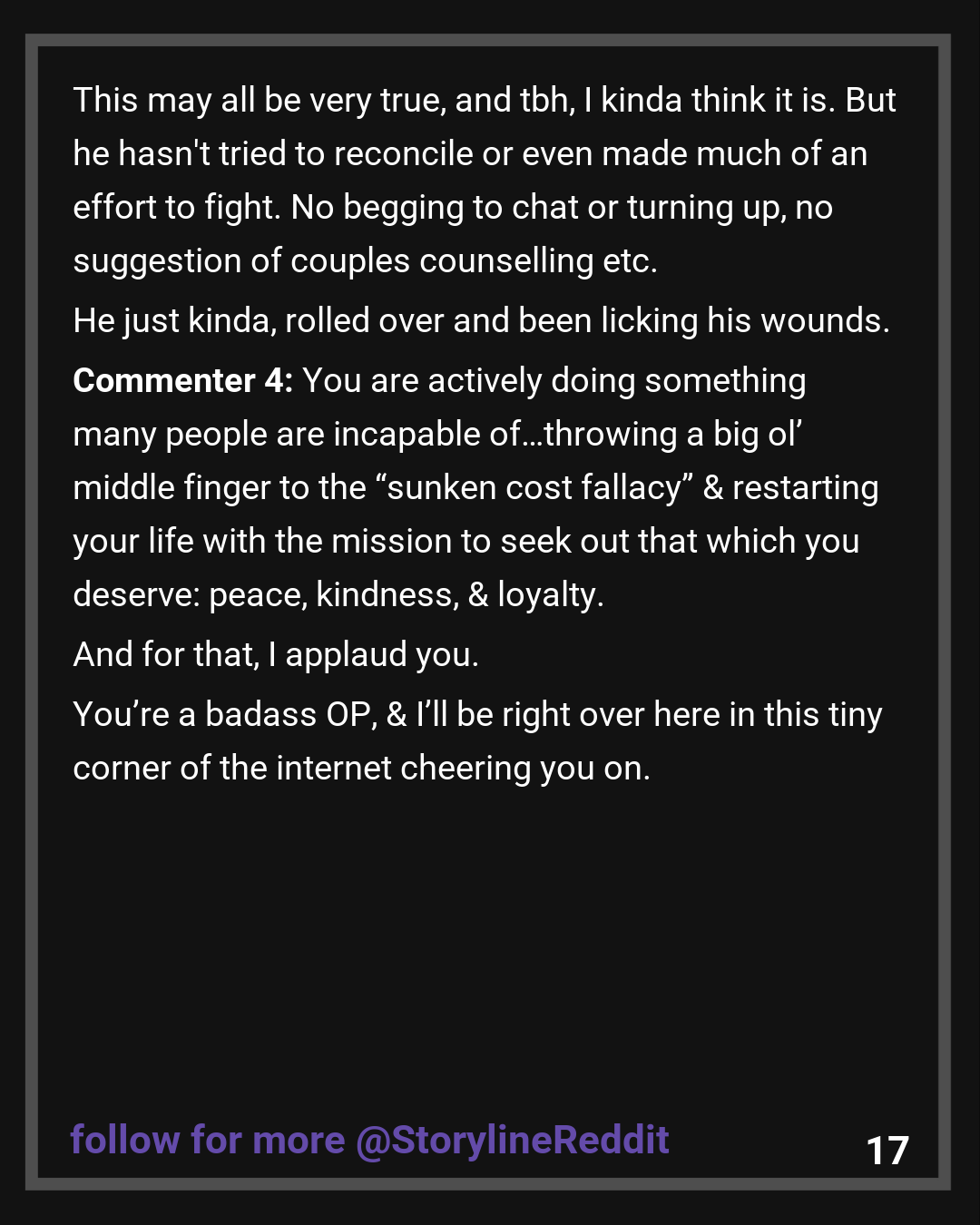 Commenter 4: You are actively doing something many people are incapable of…throwing a big ol’ middle finger to the “sunken cost fallacy” & restarting your life with the mission to seek out that which you deserve: peace, kindness, & loyalty. And for that, I applaud you.