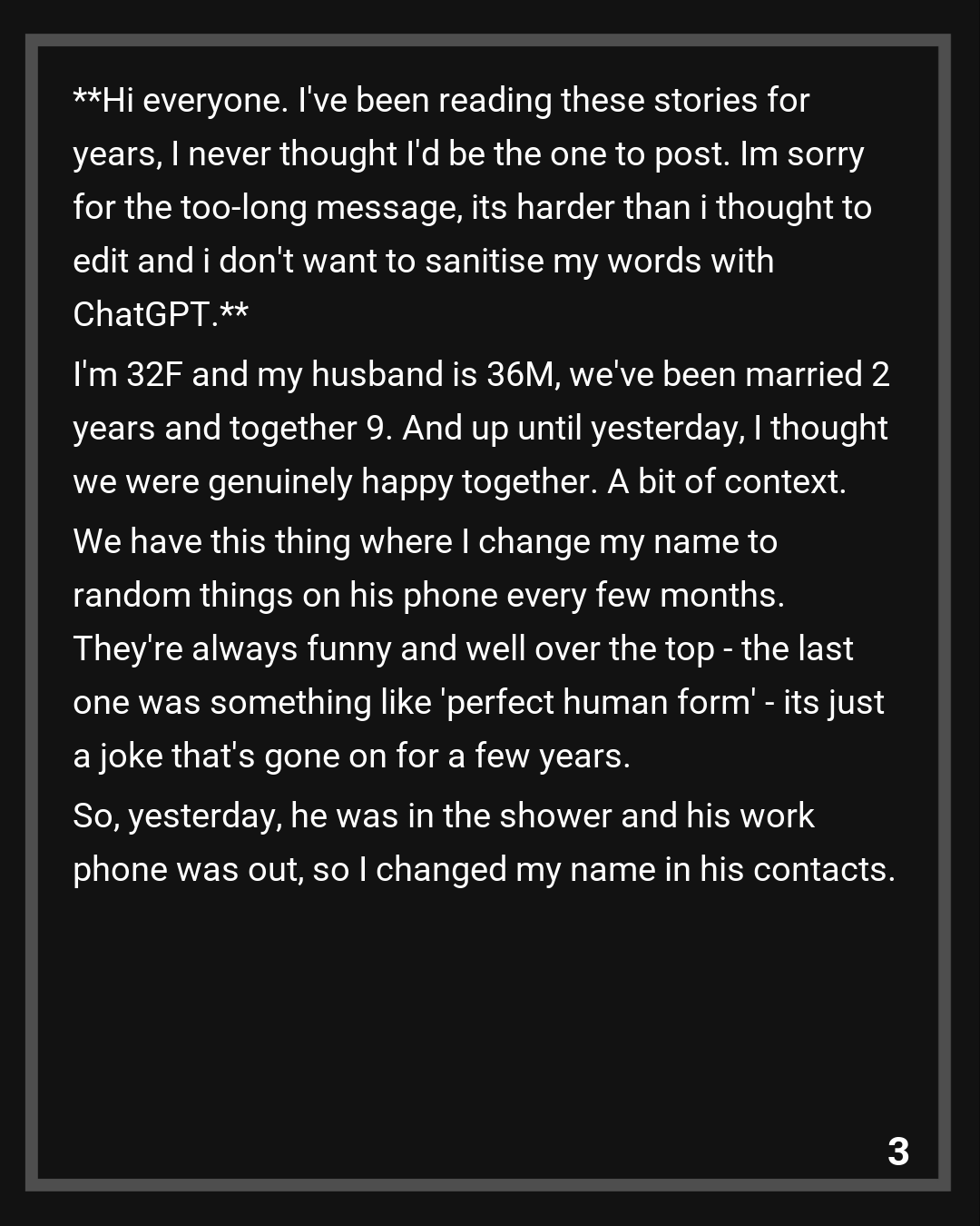 I’m 32F and my husband is 36M, we’ve been married 2 years and together 9. And up until yesterday, I thought we were genuinely happy together. A bit of context. We have this thing where I change my name to random things on his phone every few months. They’re always funny and well over the top – the last one was something like ‘perfect human form’ – its just a joke that’s gone on for a few years.