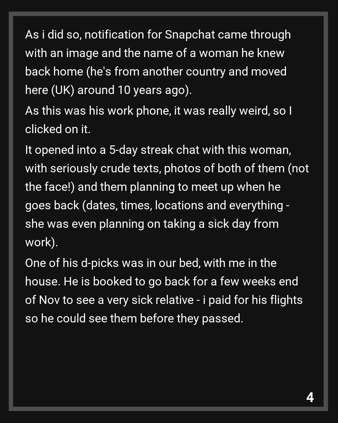 As this was his work phone, it was really weird, so I clicked on it. It opened into a 5-day streak chat with this woman, with seriously crude texts, photos of both of them (not the face!) and them planning to meet up when he goes back (dates, times, locations and everything – she was even planning on taking a sick day from work). One of his d-picks was in our bed, with me in the house. He is booked to go back for a few weeks end of Nov to see a very sick relative – i paid for his flights so he could see them before they passed. I had a panic attack and he walked out the shower to see me hyperventilating. I asked him why and how could he. He said it was only talking and that he’d been feeling neglected recently. I asked how, he said work was stressful and that he just wanted someone who “wanted him for him” and that he doesn’t feel like he’s ever enough for me. I had no idea. He hasn’t mentioned anything and nothing has changed.