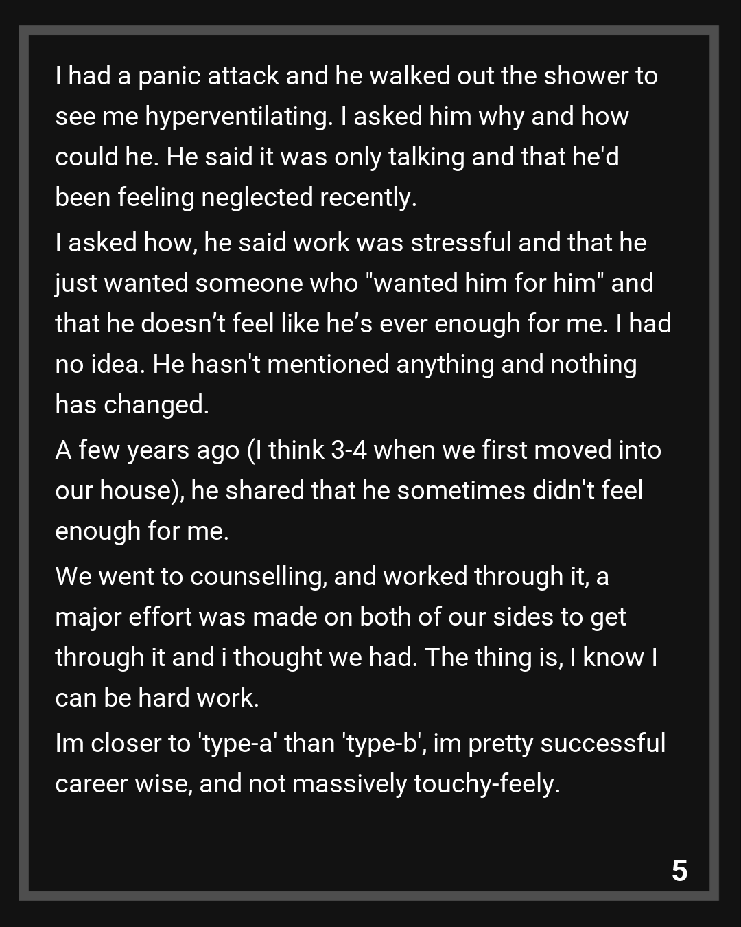 A few years ago (I think 3-4 when we first moved into our house), he shared that he sometimes didn’t feel enough for me. We went to counselling, and worked through it, a major effort was made on both of our sides to get through it and i thought we had. The thing is, I know I can be hard work. Im closer to ‘type-a’ than ‘type-b’, im pretty successful career wise, and not massively touchy-feely. But im not closed off and have never given a shit about his job or anything like that – i even supported him fof 2 years when he took a career break to try and become an actor. FFS, he hasn’t even paid towards the mortgage in 4 years as I didn’t want him to feel dependent on me/stretch his pay too thin.