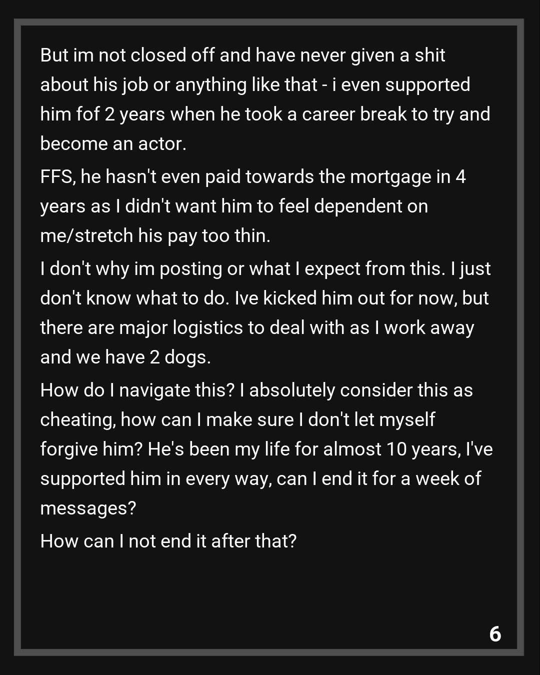 I don’t why im posting or what I expect from this. I just don’t know what to do. Ive kicked him out for now, but there are major logistics to deal with as I work away and we have 2 dogs. How do I navigate this? I absolutely consider this as cheating, how can I make sure I don’t let myself forgive him? He’s been my life for almost 10 years, I’ve supported him in every way, can I end it for a week of messages? How can I not end it after that? Sorry for all the questions and I know this post will sit unanswered in the millions of other ‘im so surprised he cheated stories’, but within 24 hours my happy, hard earned life is in flames and im staring at the wreckage.