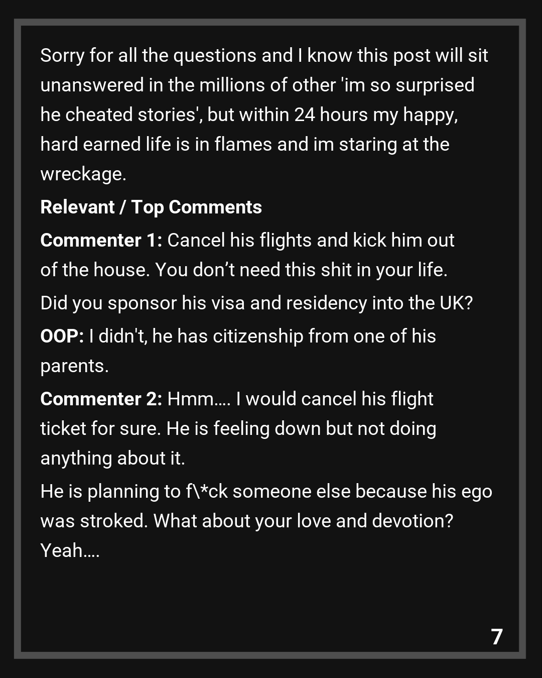 Commenter 2: Hmm…. I would cancel his flight ticket for sure. He is feeling down but not doing anything about it. He is planning to f*ck someone else because his ego was stroked. What about your love and devotion? Yeah…. is difficult but you can do it. And even if you don’t divorce him, think about the fact that he actually needs to prove that he is sorry about what he did and not because he was caught.