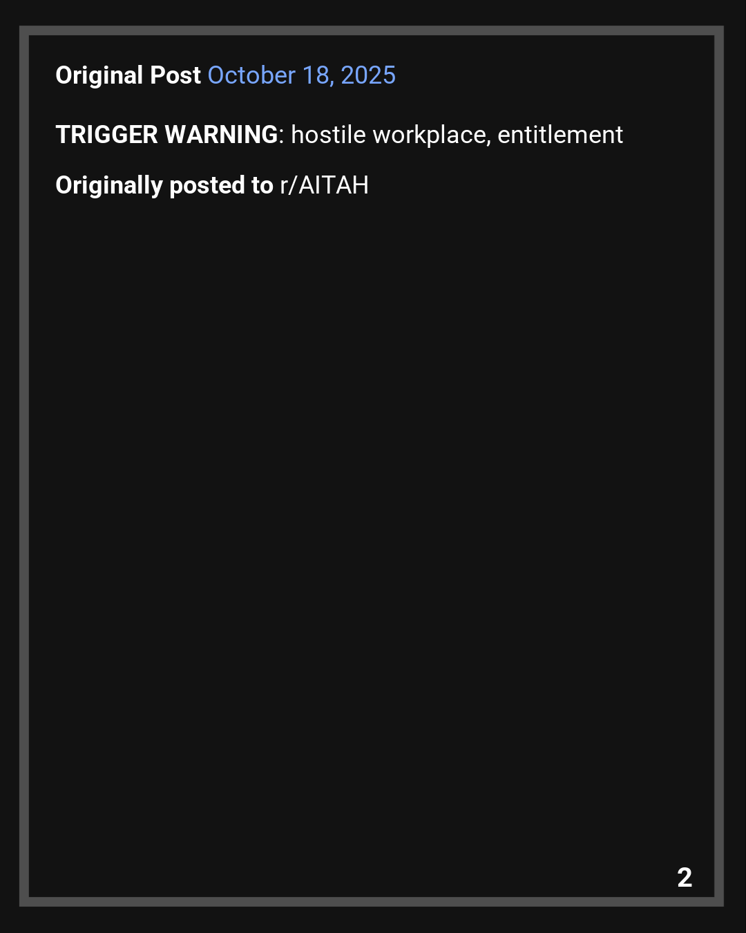 Trigger Warnings: hostile workplace, entitlement