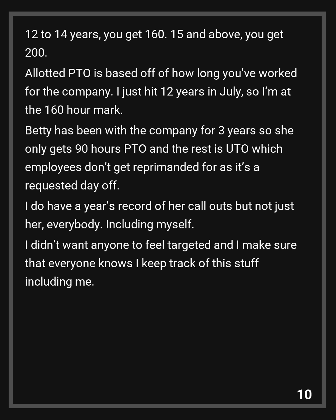 OOP: I live in the US and how it works with my company is the first 10 years in the company, you only get 90 hours of PTO. Between 10 and 12 years, you get 100 hours. 12 to 14 years, you get 160. 15 and above, you get 200. Allotted PTO is based off of how long you’ve worked for the company. I just hit 12 years in July, so I’m at the 160 hour mark. Betty has been with the company for 3 years so she only gets 90 hours PTO and the rest is UTO which employees don’t get reprimanded for as it’s a requested day off.