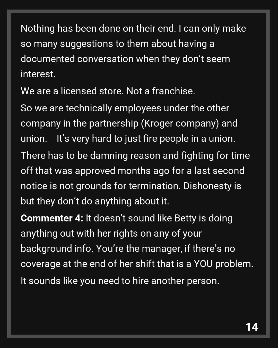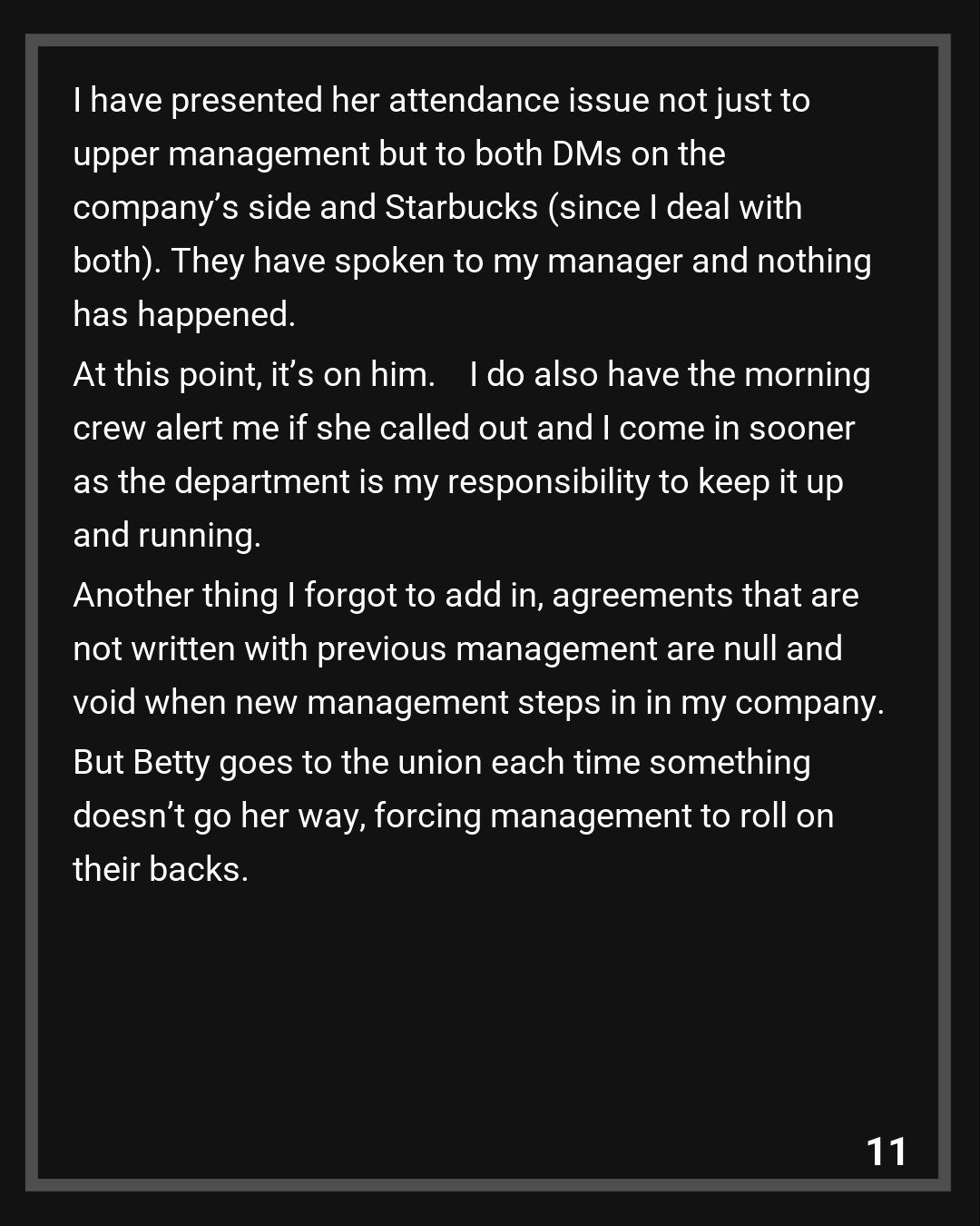 Another thing I forgot to add in, agreements that are not written with previous management are null and void when new management steps in in my company. But Betty goes to the union each time something doesn’t go her way, forcing management to roll on their backs.