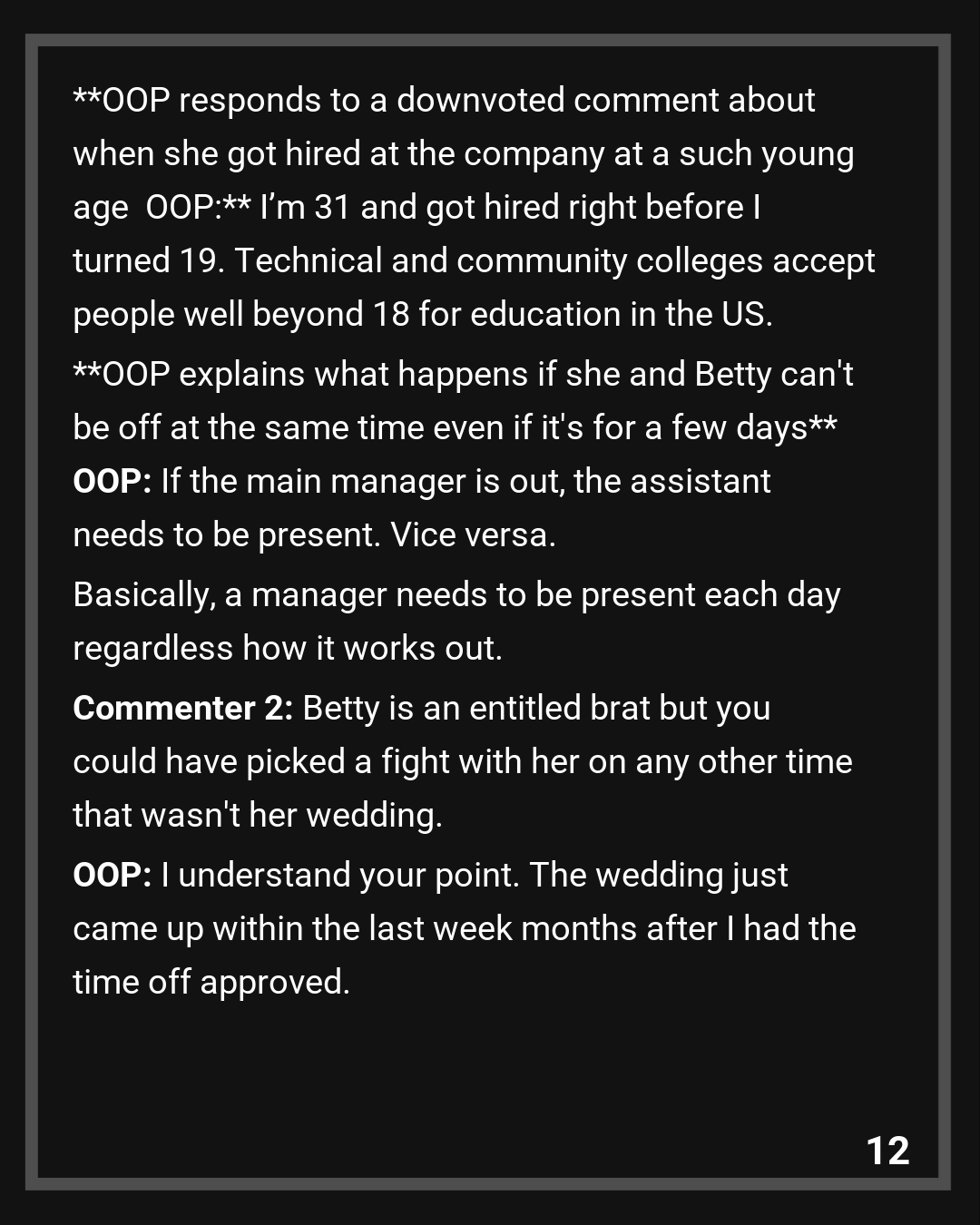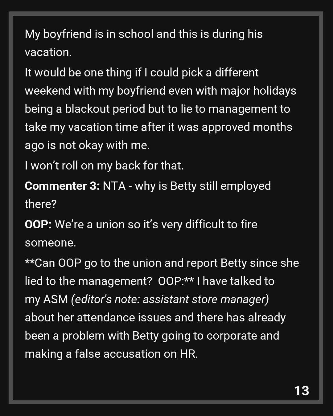 Commenter 3: NTA – why is Betty still employed there?