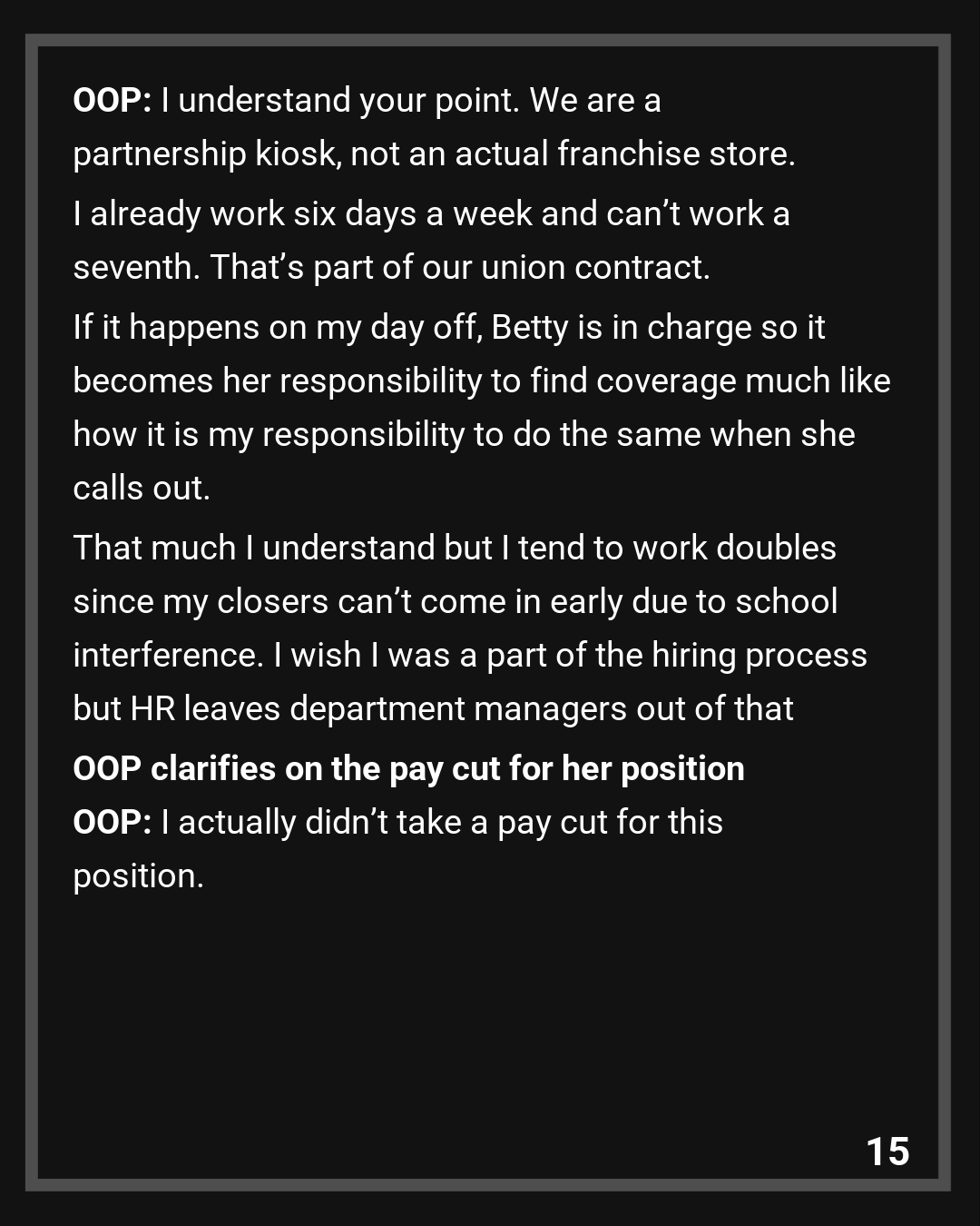 OOP: I understand your point. We are a partnership kiosk, not an actual franchise store. I already work six days a week and can’t work a seventh. That’s part of our union contract. If it happens on my day off, Betty is in charge so it becomes her responsibility to find coverage much like how it is my responsibility to do the same when she calls out. That much I understand but I tend to work doubles since my closers can’t come in early due to school interference. I wish I was a part of the hiring process but HR leaves department managers out of that