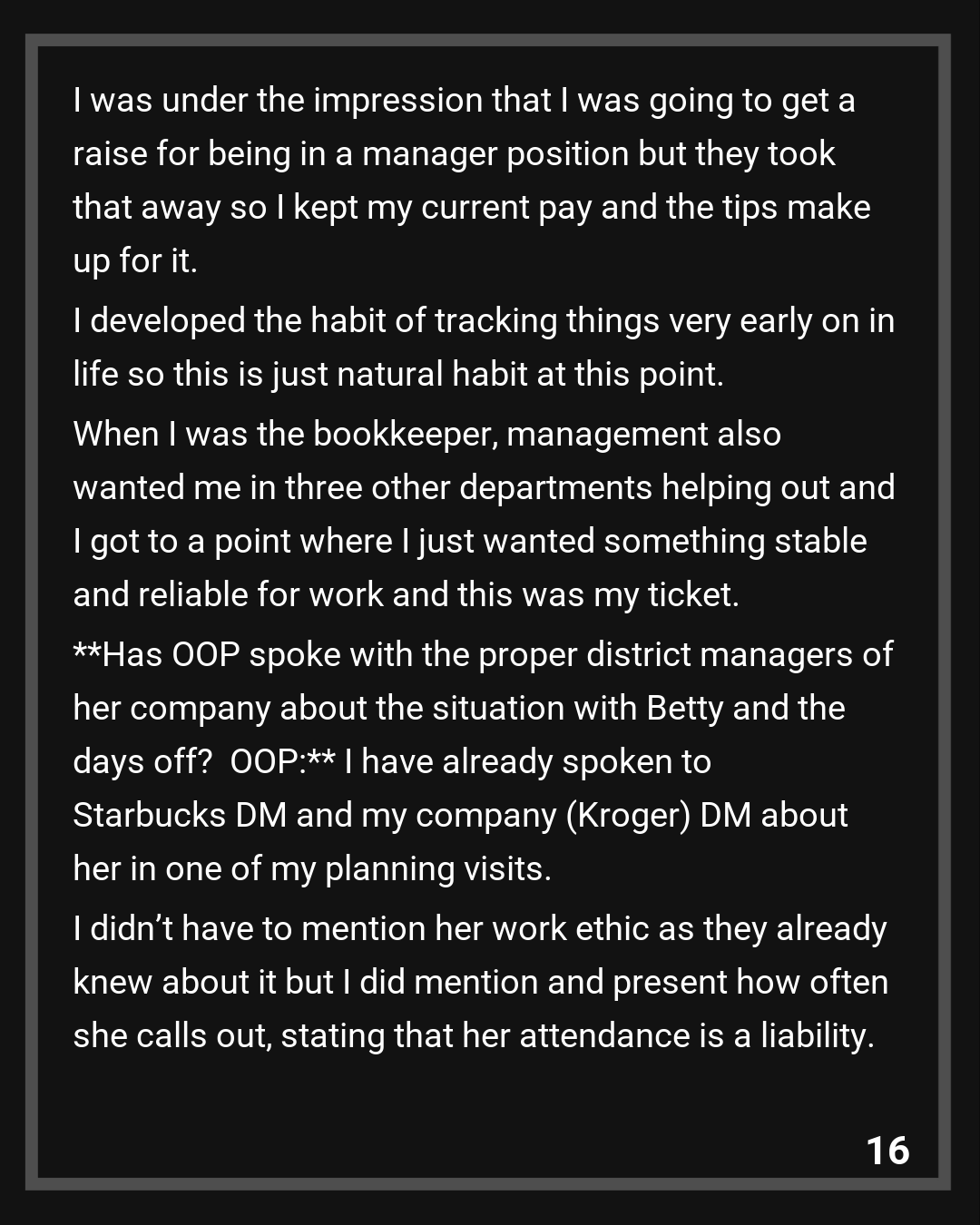OOP: I have already spoken to Starbucks DM and my company (Kroger) DM about her in one of my planning visits. I didn’t have to mention her work ethic as they already knew about it but I did mention and present how often she calls out, stating that her attendance is a liability. I know it was put in an email because I have it printed out in a file in my locker with my boss CC’d in it but nothing on his end was done about it.