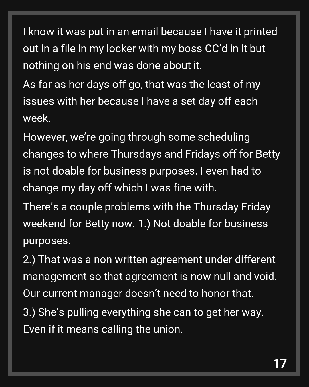 As far as her days off go, that was the least of my issues with her because I have a set day off each week. However, we’re going through some scheduling changes to where Thursdays and Fridays off for Betty is not doable for business purposes. I even had to change my day off which I was fine with. There’s a couple problems with the Thursday Friday weekend for Betty now. 1.) Not doable for business purposes. 2.) That was a non written agreement under different management so that agreement is now null and void. Our current manager doesn’t need to honor that. 3.) She’s pulling everything she can to get her way. Even if it means calling the union.