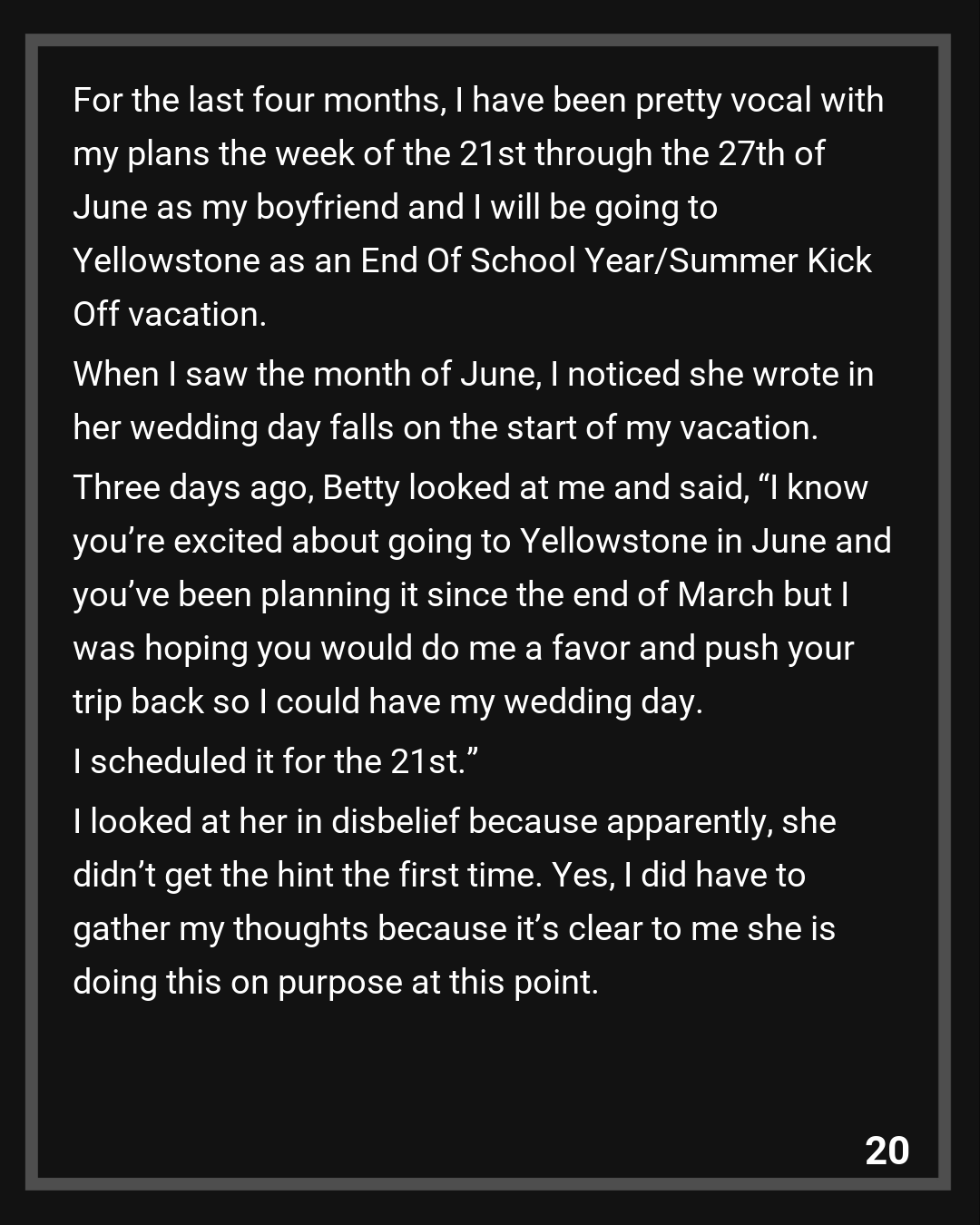 I was flipping through the planner so for the coming months, I knew what to expect and have a plan weeks in advance of important dates. I knew Betty scheduled her wedding date but didn’t know when. I only had the hint that it would fall towards the end of May to early June (in a local park you can rent part of for the day…no shaming but I know that dates can be switched easier than an actual venue) which works for me as I will be around. For the last four months, I have been pretty vocal with my plans the week of the 21st through the 27th of June as my boyfriend and I will be going to Yellowstone as an End Of School Year/Summer Kick Off vacation. When I saw the month of June, I noticed she wrote in her wedding day falls on the start of my vacation.