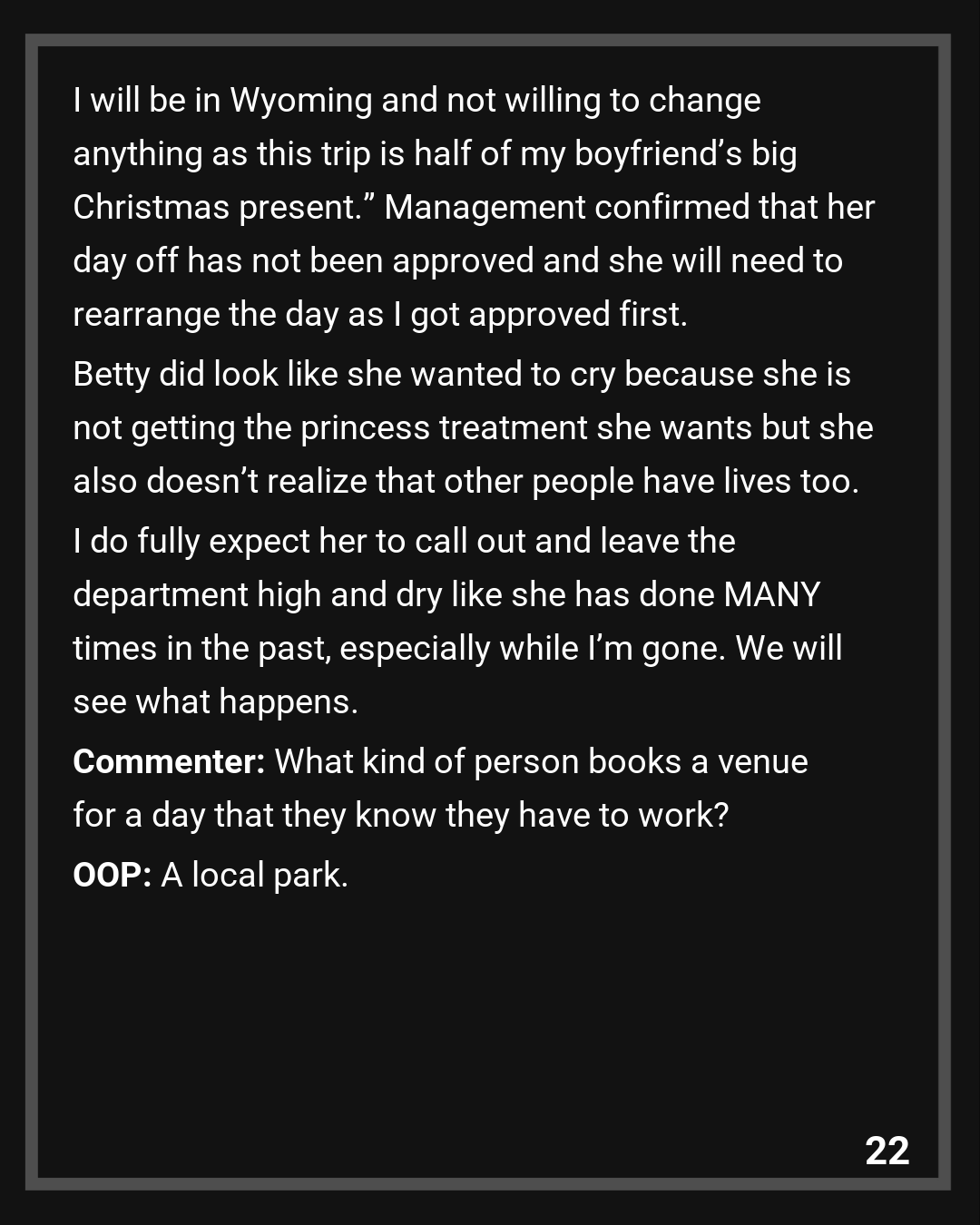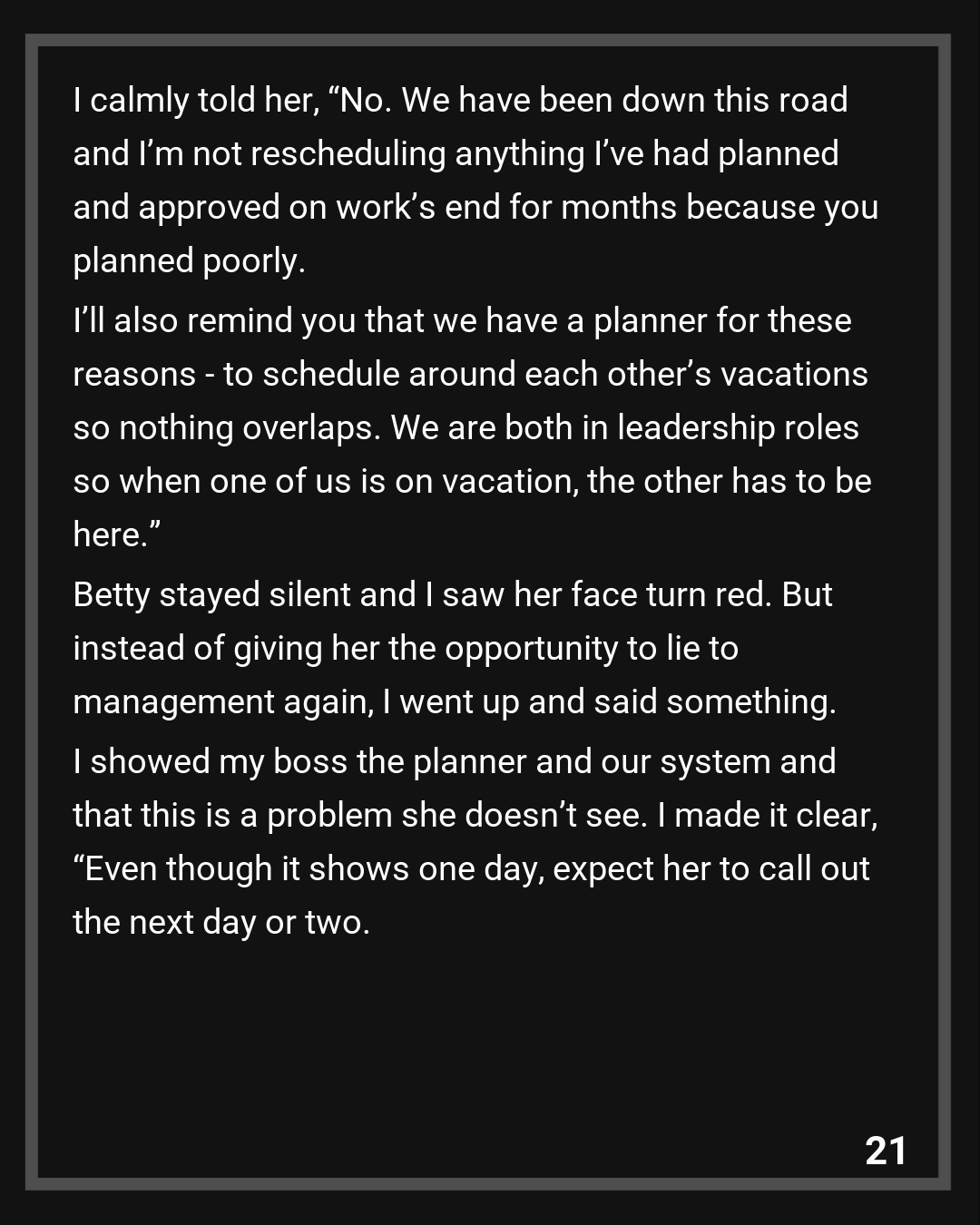 Betty stayed silent and I saw her face turn red. But instead of giving her the opportunity to lie to management again, I went up and said something. I showed my boss the planner and our system and that this is a problem she doesn’t see. I made it clear, “Even though it shows one day, expect her to call out the next day or two. I will be in Wyoming and not willing to change anything as this trip is half of my boyfriend’s big Christmas present.” Management confirmed that her day off has not been approved and she will need to rearrange the day as I got approved first.