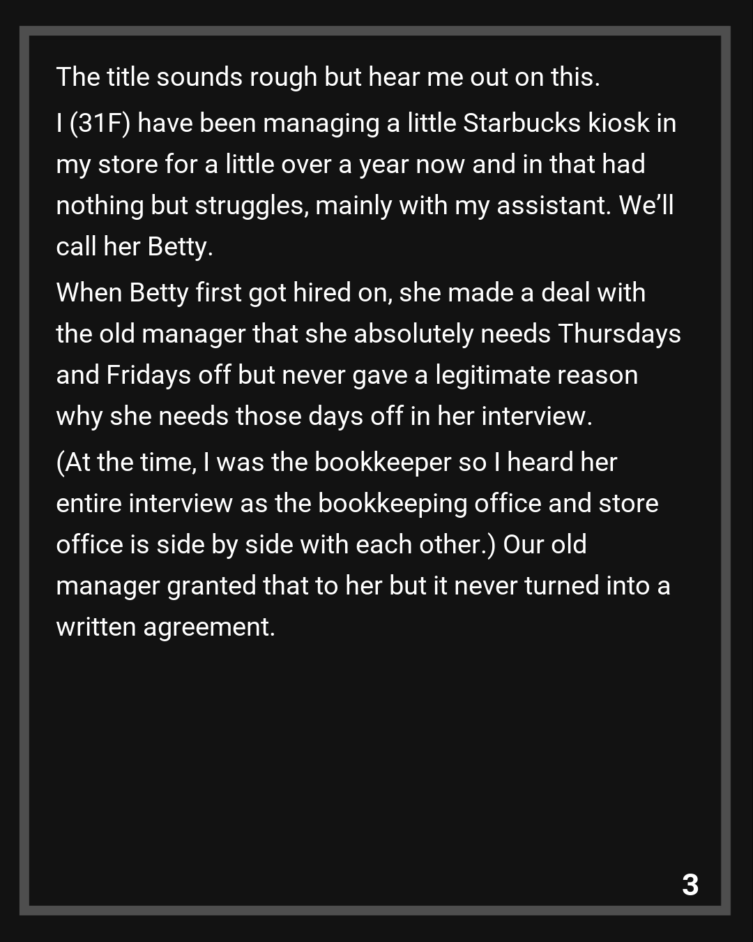 I (31F) have been managing a little Starbucks kiosk in my store for a little over a year now and in that had nothing but struggles, mainly with my assistant. We’ll call her Betty.