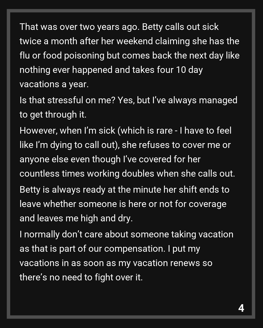 When Betty first got hired on, she made a deal with the old manager that she absolutely needs Thursdays and Fridays off but never gave a legitimate reason why she needs those days off in her interview. (At the time, I was the bookkeeper so I heard her entire interview as the bookkeeping office and store office is side by side with each other.) Our old manager granted that to her but it never turned into a written agreement. That was over two years ago. Betty calls out sick twice a month after her weekend claiming she has the flu or food poisoning but comes back the next day like nothing ever happened and takes four 10 day vacations a year. Is that stressful on me? Yes, but I’ve always managed to get through it. However, when I’m sick (which is rare – I have to feel like I’m dying to call out), she refuses to cover me or anyone else even though I’ve covered for her countless times working doubles when she calls out. Betty is always ready at the minute her shift ends to leave whether someone is here or not for coverage and leaves me high and dry.