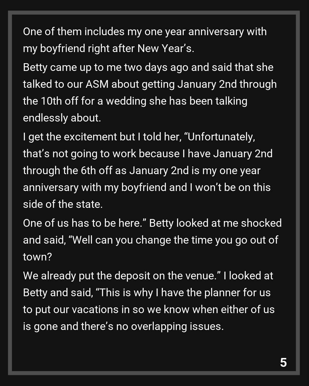 I normally don’t care about someone taking vacation as that is part of our compensation. I put my vacations in as soon as my vacation renews so there’s no need to fight over it. One of them includes my one year anniversary with my boyfriend right after New Year’s. Betty came up to me two days ago and said that she talked to our ASM about getting January 2nd through the 10th off for a wedding she has been talking endlessly about. I get the excitement but I told her, “Unfortunately, that’s not going to work because I have January 2nd through the 6th off as January 2nd is my one year anniversary with my boyfriend and I won’t be on this side of the state. One of us has to be here.” Betty looked at me shocked and said, “Well can you change the time you go out of town? We already put the deposit on the venue.” I looked at Betty and said, “This is why I have the planner for us to put our vacations in so we know when either of us is gone and there’s no overlapping issues. I’ve had this time off approved since the end of July and I’m not willing to change it or give you my planned vacation time that works for my boyfriend and I before he begins his next quarter of school.” I could tell that Betty was furious and all I got was, “We’ll see about that.”