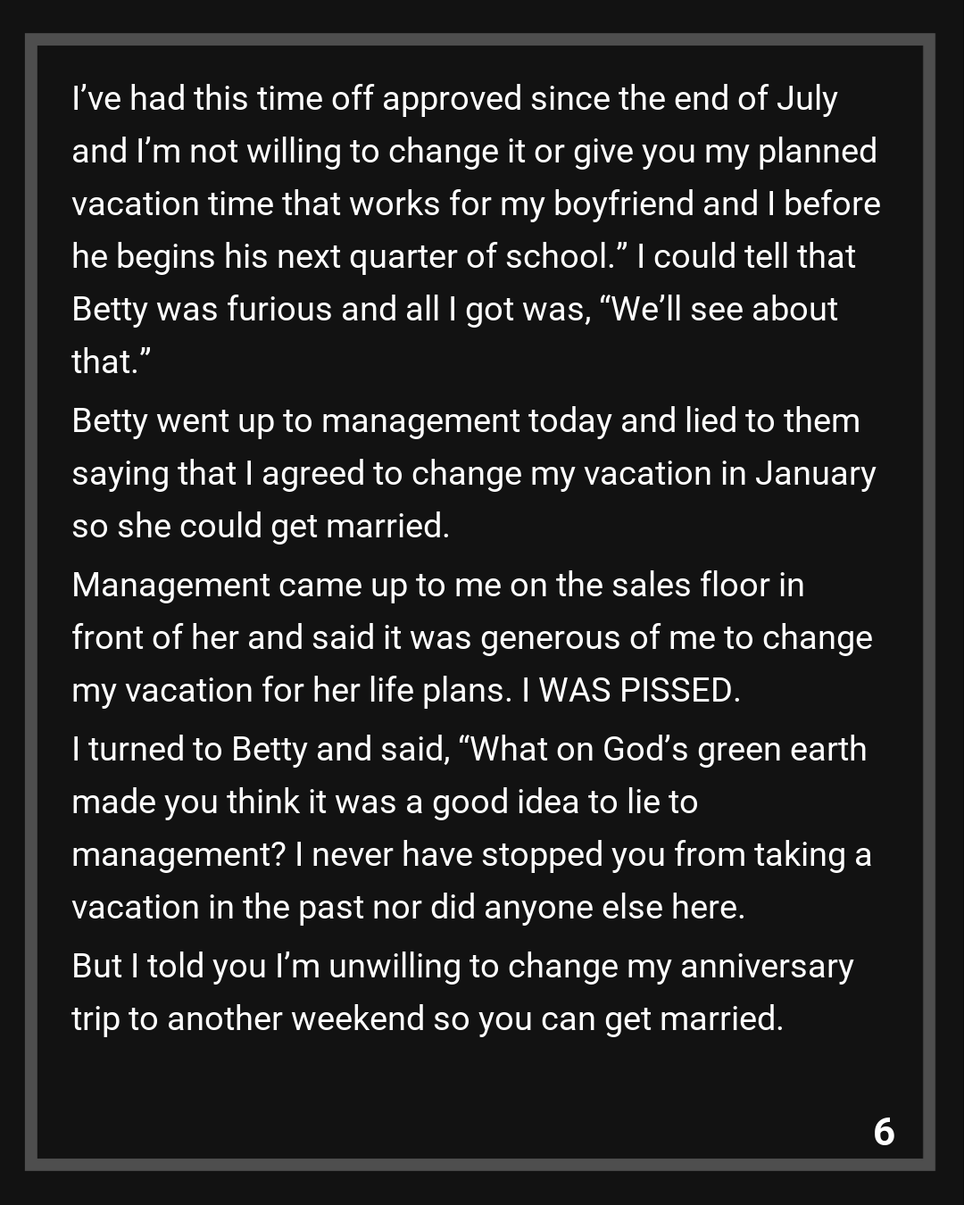 Betty went up to management today and lied to them saying that I agreed to change my vacation in January so she could get married. Management came up to me on the sales floor in front of her and said it was generous of me to change my vacation for her life plans. I WAS PISSED. I turned to Betty and said, “What on God’s green earth made you think it was a good idea to lie to management? I never have stopped you from taking a vacation in the past nor did anyone else here. But I told you I’m unwilling to change my anniversary trip to another weekend so you can get married. I’m sorry you’ll be losing money but you have to pick a different day.” This is where I turned to management and told them, “If you still approve this, not only will I go to corporate and the union and complain but you’ll be looking for a new manager for this department. I will not be treated this way for one person to get whatever she wants.”