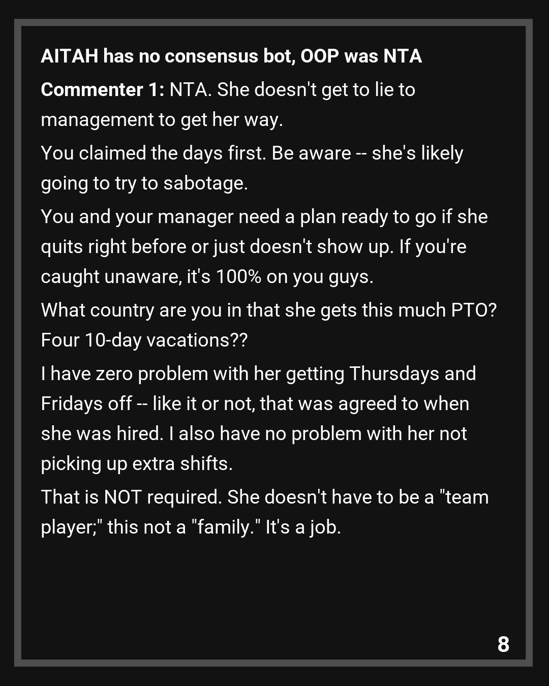 Commenter 1: NTA. She doesn’t get to lie to management to get her way. You claimed the days first. Be aware — she’s likely going to try to sabotage. You and your manager need a plan ready to go if she quits right before or just doesn’t show up. If you’re caught unaware, it’s 100% on you guys.
