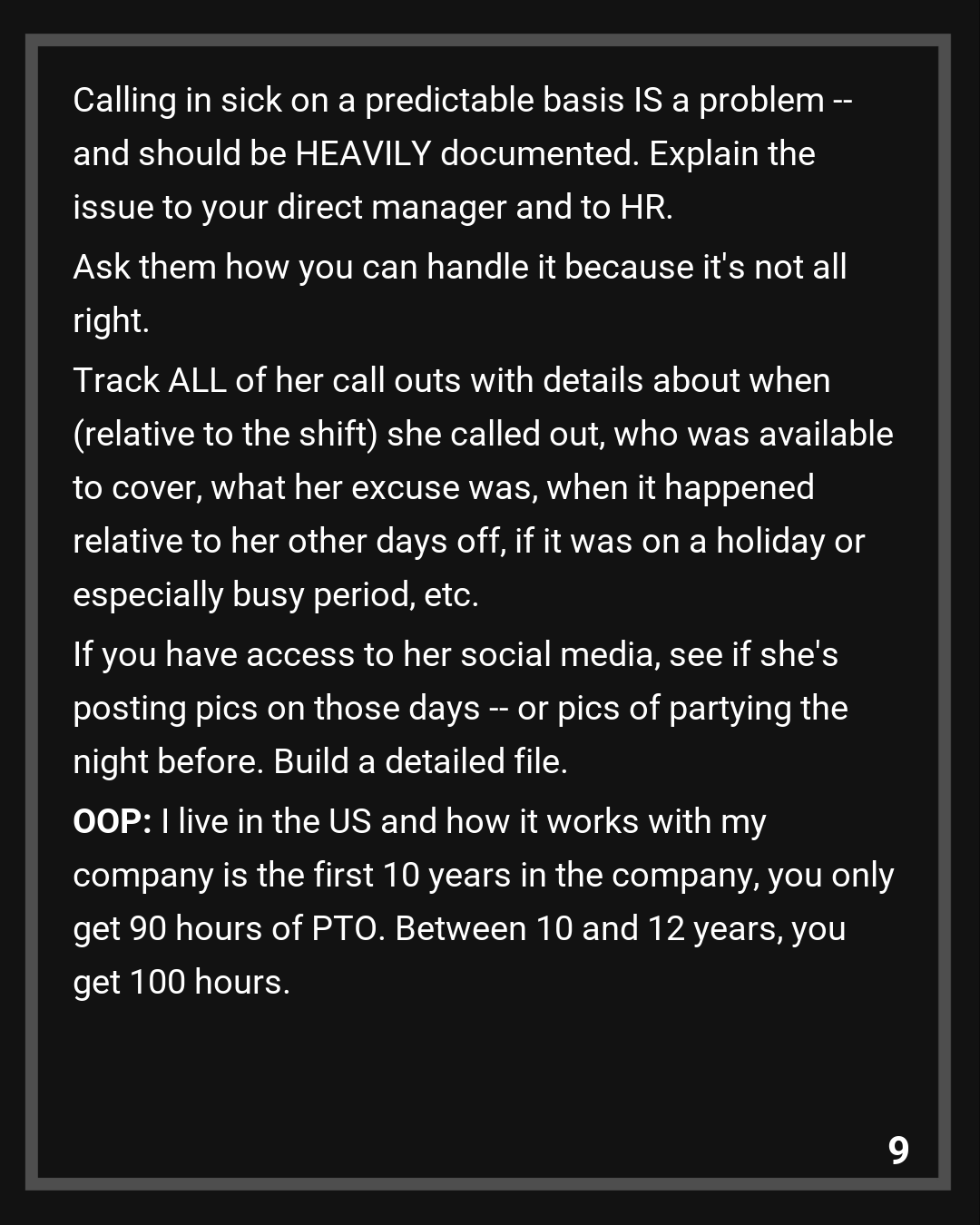 Track ALL of her call outs with details about when (relative to the shift) she called out, who was available to cover, what her excuse was, when it happened relative to her other days off, if it was on a holiday or especially busy period, etc. If you have access to her social media, see if she’s posting pics on those days — or pics of partying the night before. Build a detailed file.